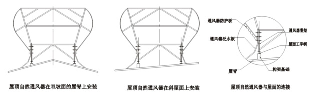 五、屋頂通風(fēng)器的安裝示圖 屋頂通風(fēng)器安裝在用戶提供的基礎(chǔ)構(gòu)架上,構(gòu)架面應(yīng)做成水平。可以單排布置,也可雙排布置,可布置在雙坡屋面的屋脊處,也可布置在斜屋面上。屋頂通風(fēng)器安裝完畢后,應(yīng)作防水處理。 ![]()